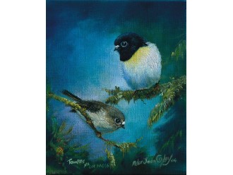 The male Tomtit is black with a yellow-cream breast while the female is brown with an off white breast. They pair up and stay in the same area all their lives.